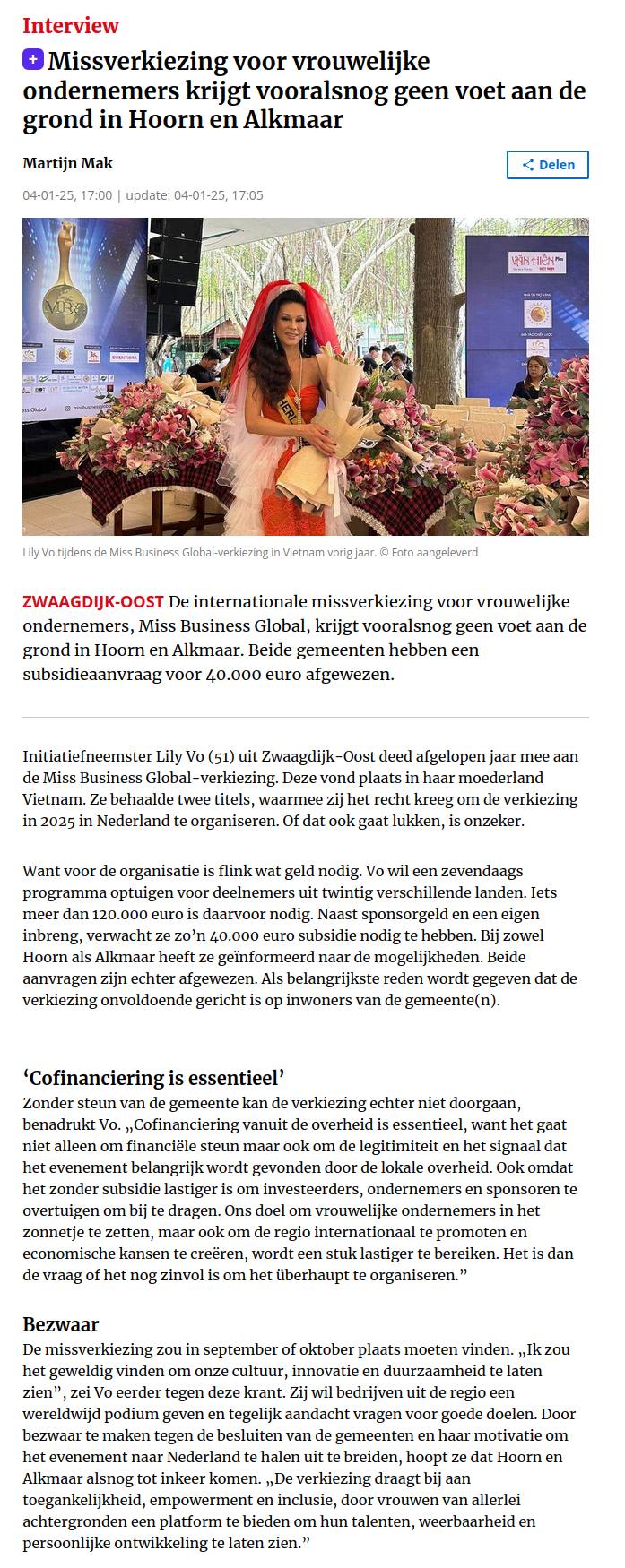 Miss Business Global 2025 is een miss-verkiezing voor vrouwelijke ondernemers die elkaar inspireren. Bedrijven kunnen hun producten en diensten laten zien. Door deze internationale verkiezing kunnen we Nederland promoten en zaken doen.